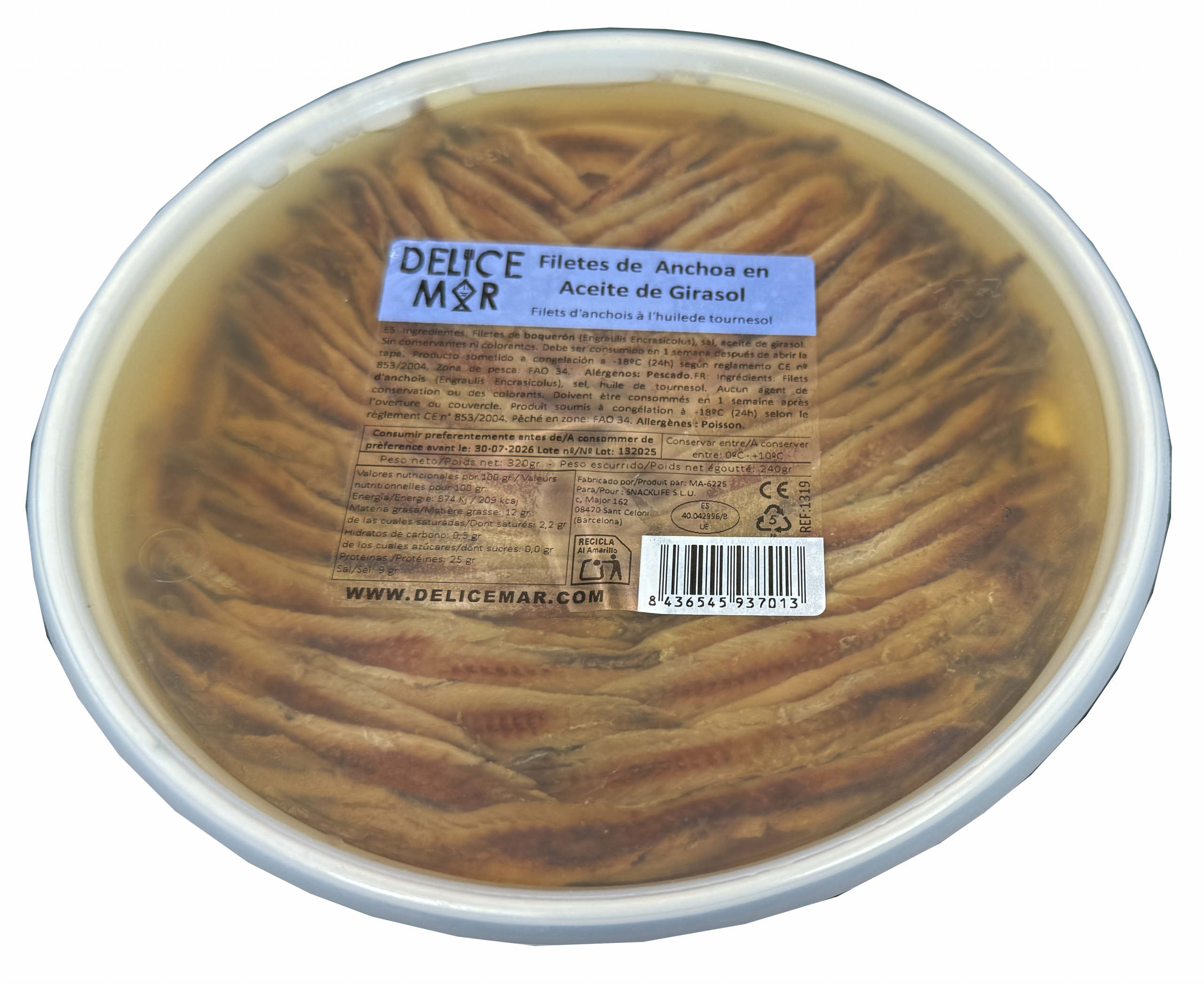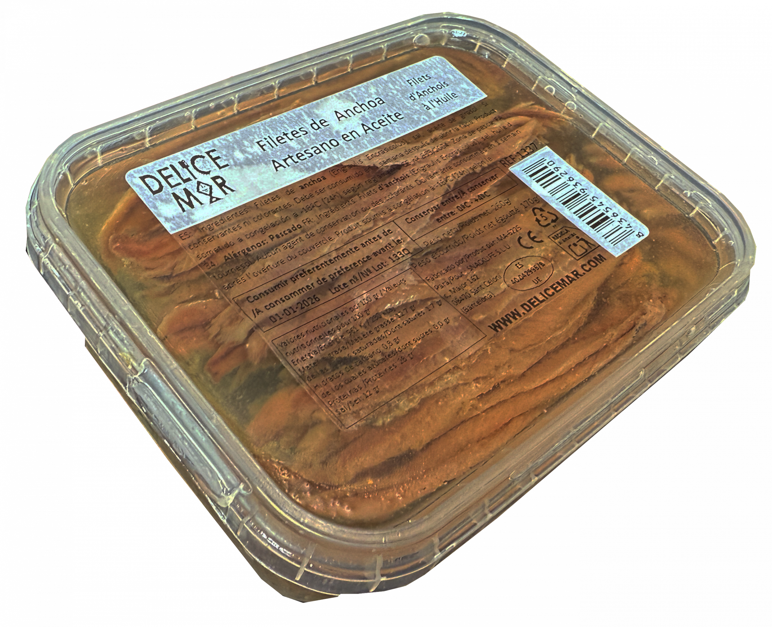 DELICEMAR dispone de anchoas y las presentamos en envases que van desde los 40 gr hasta los 300 gr.